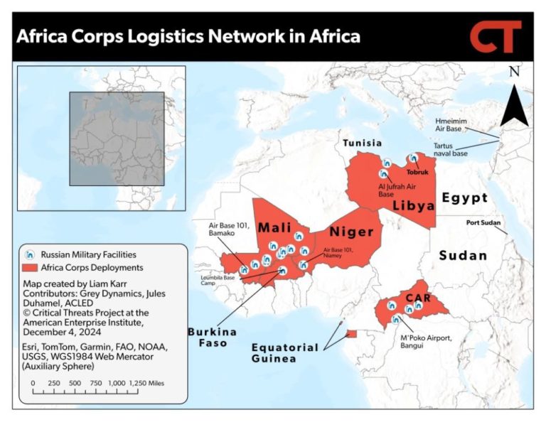 Au Burkina Faso, une force de mercenaires russe de 300 membres d’une société appelée Bear est arrivée en mai 2024, mais a été rappelée trois mois plus tard pour aller se battre en Ukraine.