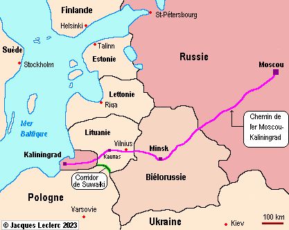 En effet, l’enclave russe n’est reliée à la Biélorussie, pays allié de la Russie, que par le corridor de Suwalki qui, curieusement, n’a pas de route d’accès est-ouest. Les liaisons terrestres se font par la ligne de voie ferrée Moscou-Minsk-Kaliningrad qui passe plus au nord à travers la Lituanie.
