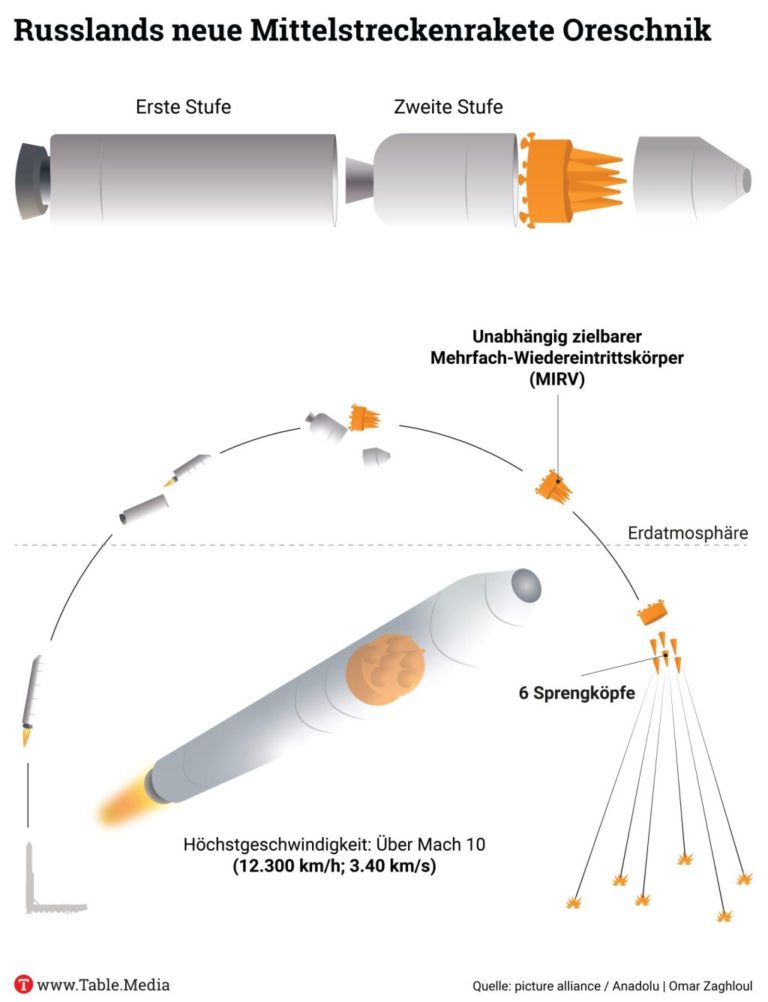 Il y a un débat sur la place de l’Oreshnik dans le spectre des missiles balistiques, Poutine le qualifiant d’arme de moyenne portée (MRBM) et les responsables américains le classant dans la catégorie des missiles à portée intermédiaire (IRBM). Il est donné pour avoir une portée maximale de 5.000 kilomètres.