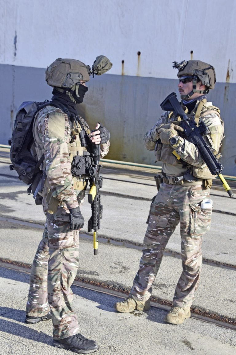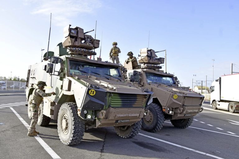 À terre, les légionnaires de la 2e compagnie du 2e REI assurent la bulle de sécurité extérieure presque sur tout le périmètre du port afin de ne laisser aucun intrus passer. Aucune arme lourde n’est visible, ce qui ne veut pas forcément dire qu’il n’y en a pas. Seuls quelques blindés de transport de troupes ont marqué leur territoire, à l’entrée est du site.