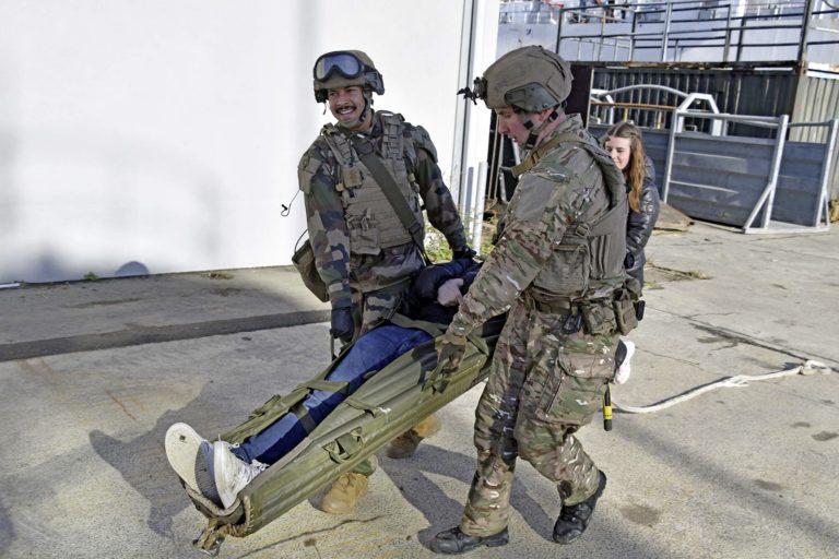 Sur le pont du Mistral, le pacha du navire, à savoir le capitaine de vaisseau Quentin Vieux-Rochas (commando marine de spécialité), explique à la presse la répartition des tâches avec son collègue chef de corps du 2e REI : « On a un peu de friction dans les délais, mais, pour l’instant, tout va bien. Par ricochet, la frégate censée nous escorter dans cet exercice a été saturée en menaces aériennes ; elle a subi des dommages très importants, avec des blessés. J’ai dû en accueillir environ une dizaine, ce qui n’était pas prévu ; et c’est tout l’enjeu de réussir à le faire. Ce n’est pas totalement anodin en termes d’organisation. À bord, nous avons une capacité sanitaire, mais ce n’est pas un hôpital stricto sensu [même si le PHA peut être transformé en hôpital flottant, mais avec de l’équipement et des personnels dédiés, comme ce fut le cas pour le Dixmude à quai, en Égypte, par le passé… NDLA]. On peut accueillir un volume important de ressortissants, 500 aujourd’hui, potentiellement jusqu’à 2 000 sur une durée de 24 heures. Certaines zones sont aménagées pour que les gens puissent se reposer, s’occuper un minimum tout en restant dans une zone sécurisée, car on ne peut pas évoluer librement sur un bateau ; il faut trouver le bon équilibre pour que les gens puissent être sereins sans pour autant créer de l’entropie à bord. »