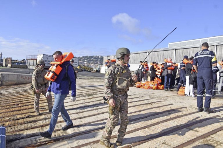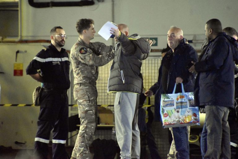 « Pas de drogue, pas d’armes ? » Depuis une bonne heure, ce membre de la brigade de protection du bord répète inlassablement la même antienne aux civils qui déboulent face à lui. Il n’est pourtant qu’un des filtres de sécurité, ni le premier ni le dernier, faisant face aux centaines de civils qui cherchent à rejoindre le porte-hélicoptères amphibie Mistral, qui attend ses passagers à quelques nautiques de la côte. Derrière les infrastructures portuaires de Sète (Hérault), on ne voit pas grand-chose, mais les allers-retours d’embarcations amphibies en disent long sur le type de navire posté en mer.