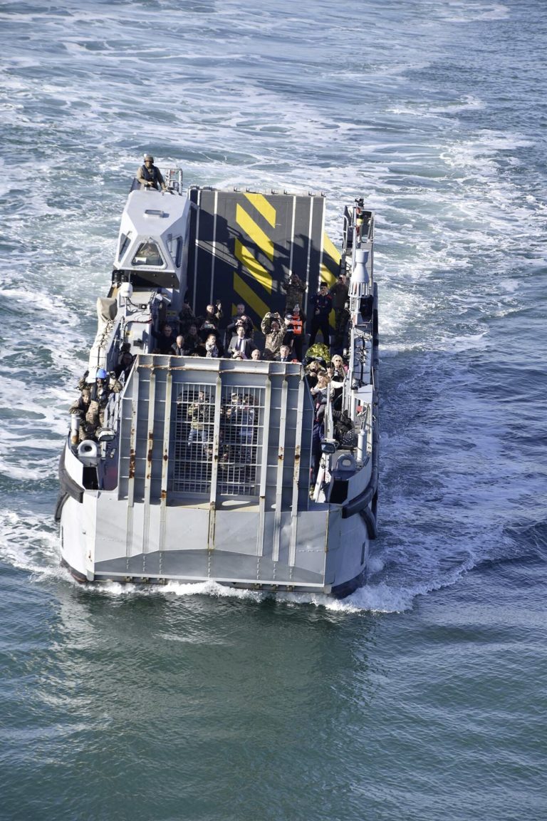 Parmi les navires impliqués figure aussi le bâtiment ravitailleur de forces (BRF) Jacques Stosskopf qui, dans le scénario, a déjà embarqué un demi-millier de ressortissants. Fictivement, l’équipage ne pourra donc pas avoir une idée des difficultés générées par une telle charge : transit depuis la côte en semi-rigides par paquets d’une toute petite dizaine de ressortissants (soit une cinquantaine de rotations), prise en charge à bord sur un navire pas vraiment conçu pour cela…