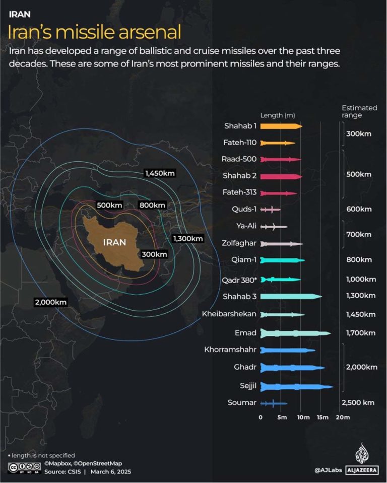 Selon les analystes du renseignement américain, l’Iran possède le plus grand stock de missiles balistiques du Moyen-Orient. Les missiles iraniens à la plus longue portée seraient capables d’atteindre des cibles situées jusqu’à 2.000 kilomètres couvrant ainsi tout le Moyen-Orient et une partie de l’Europe.