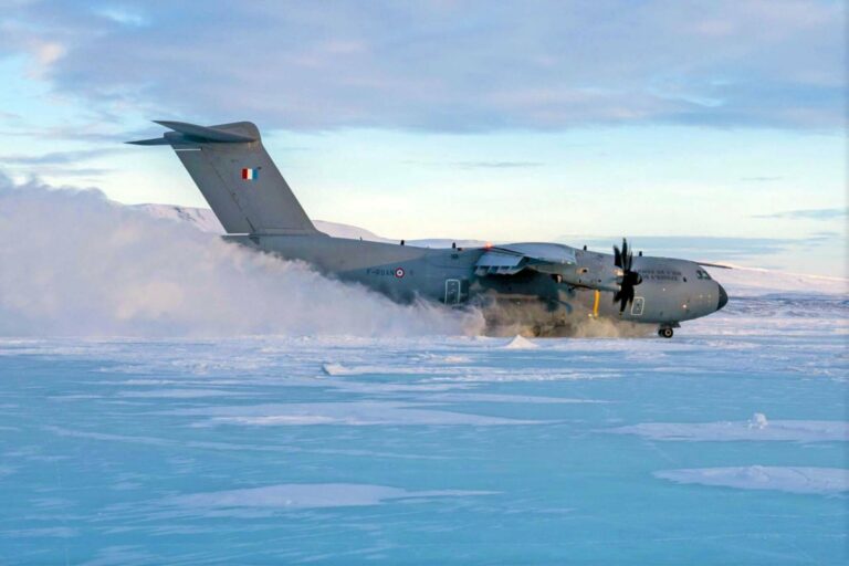 Nouvelle illustration de l’agilité et de la versatilité de l’A400M, puisqu’un exemplaire de l’armée de l’Air et de l’Espace s’est posé sur la banquise arctique mi-mars. La séquence a mobilisé l’expertise du 25e régiment du génie de l’air (RGA). L’A400M peut poser sur des terrains sommaires, pour autant qu’ils soient préalablement reconnus par le 25e RGA et/ou le commando parachutiste de l’air no 10 qui possède la capacité à reconnaître un terrain de poser d’assaut (RTPA) et de faire atterrir l’avion discrètement avec un balisage adapté convenu à l’avance, ce qui permet de limiter les émissions avant l’arrivée de l’avion.