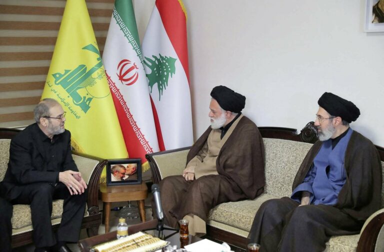 Mojtaba Khamenei (à droite, en bleu), devenu Guide suprême d'Iran le 8 mars 2026, visite le 1er octobre 2024 la représentation du Hezbollah à Téhéran aux côtés d'un dignitaire du mouvement et d'un responsable libanais. La présence conjointe des drapeaux du Hezbollah, de l'Iran et du Liban met en scène la cohésion stratégique de l'axe Téhéran-Hezbollah-Liban.