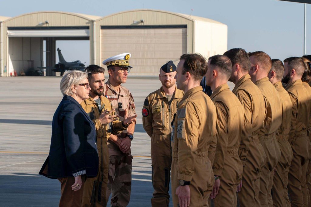 Catherine Vautrin a profité des vœux présidentiels aux Émirats arabes unis pour visiter la base aérienne 104, qui affiche désormais une quinzaine d’années d’existence. Elle a notamment pu découvrir le détachement Rafale (sept monoplaces et biplaces) et son pod de reconnaissance Reco-NG, ainsi que le détachement ATL-2 (avec apparemment plusieurs appareils) qui participe à l’appréciation de situation autonome dans le golfe Persique. Un A400M complète ces moyens...