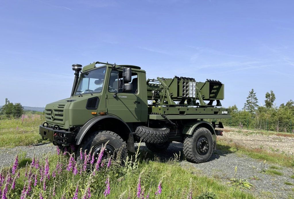 Le contrat comprend la livraison des munitions associées (mines antichars AT2+ pour la précision), d’autres équipements annexes et la formation des personnels à l’utilisation du système Skorpion 2. Pouvant être installé sur un plateau de 10 pouces, par exemple sur celui d’un camion 4 x 4 Unimog U -5000 5T comme ici sur la photo, ou bien sur une remorque tractée, ce système de minage rapide peut aussi utiliser des plates-formes plus importantes, de 20 pouces...